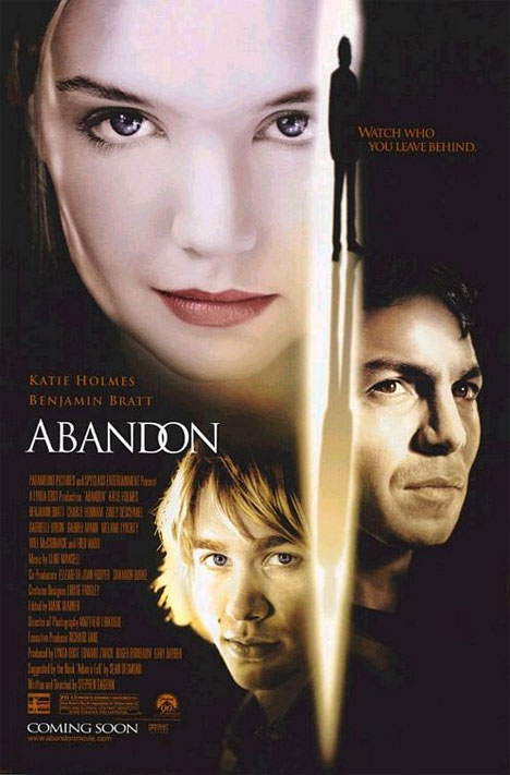 Abandon is a 2002 American psychological thriller drama film written and directed by Stephen Gaghan. It stars Katie Holmes as a college student whose boyfriend (Charlie Hunnam) disappeared two years previously. Despite being set at an American university, much of the movie was filmed in Canada at McGill University's McConnell Hall. It is based on the book Adams Fall by Sean Desmond. The book was re-titled Abandon for the movie tie-in paperback printing. The film co-stars Zooey Deschanel and Gabrielle Union, with Benjamin Bratt playing the detective investigating the boyfriend's disappearance. It received generally negative reviews.